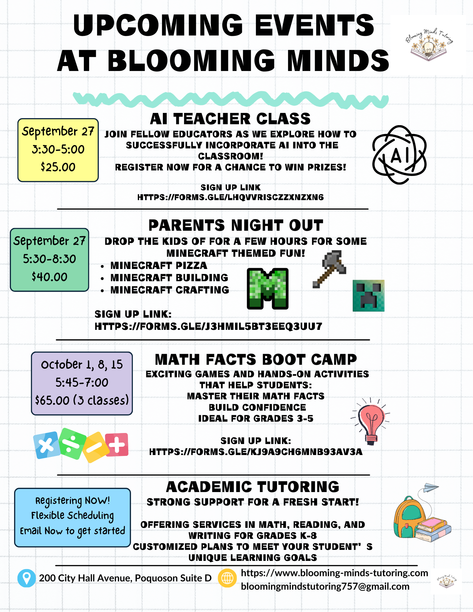 At Blooming Minds Tutoring, we cultivate mathematical thinkers. We teach multiple problem-solving strategies to determine which approach best helps enhance each child’s math skills. Our students develop a deep understanding of mathematical concepts, enabling them to tackle challenges with confidence and creativity. Join us in exploring the diverse paths to mathematical proficiency